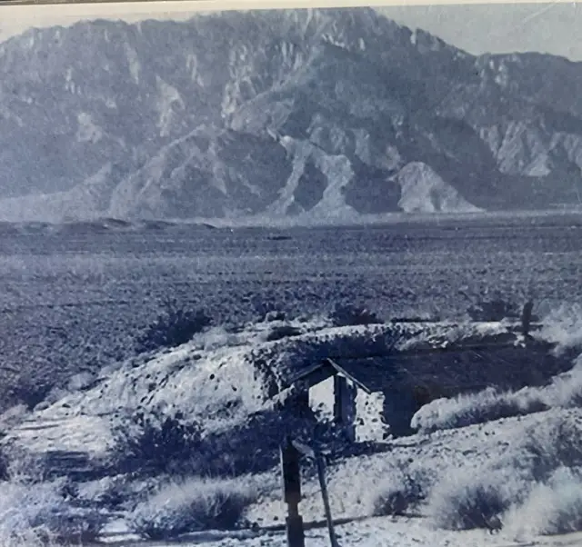 The original cabin nestled in the hill side. The first hot water well in the foreground and located from what has remained the Main Well for the Ranch